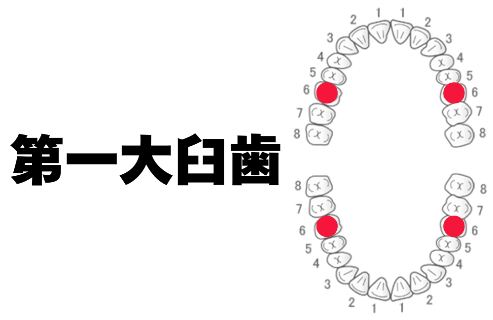 6番は「第一大臼歯」と呼ばれる歯で、一般的には6歳頃に生えてくることから「6歳臼歯」とも呼ばれています。