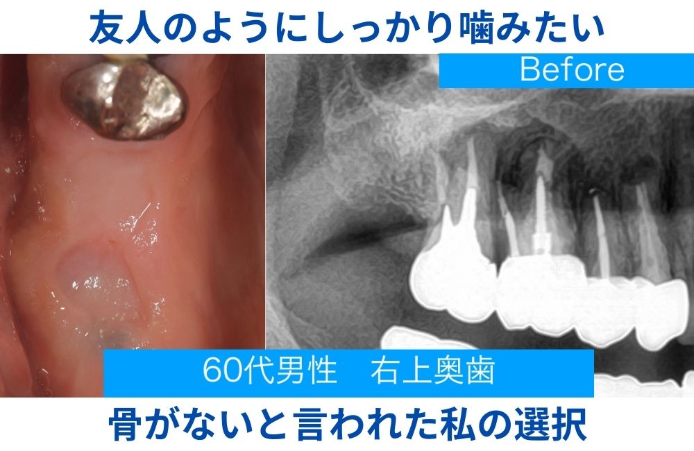 初診時の様子 患者様とのやり取り 検査後の説明 まとめ 今回のご相談は、「右で噛めない」「骨がない」とお悩みだった40代男性。精密検査の結果、サイナスリフトで骨を再生し、2本のインプラント埋入を行う計画となりました。 同じように「片側でしか噛めない」「骨がないと言われた」と悩んでいる方も、状態によってはまだ選択肢が残されています。まずは骨の状態をしっかり調べ …