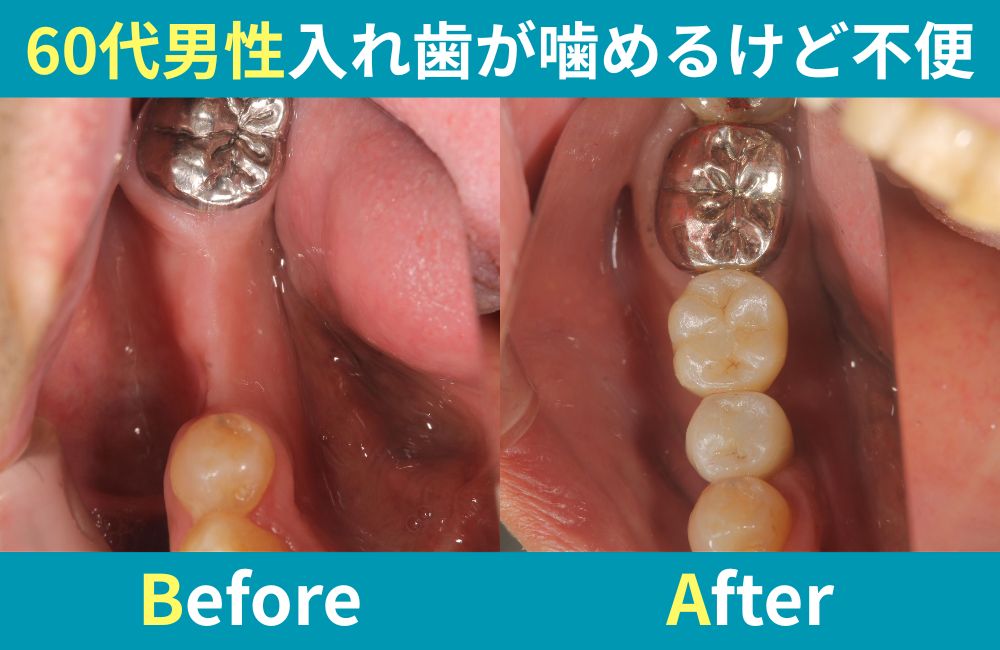 入れ歯が噛めるけど不便…そんなお悩みありませんか? 「入れ歯は使えてはいるけど、やっぱり食事のときに気になる…」そんなふうに感じている方は少なくありません。今回は62歳男性の方との相談をもとに、実際のやり取りをご紹介します。 初診の問診 検査診断と骨の状態 検査の結果、右下の奥歯(5番・6番)が欠損しており、骨の幅がかなり減少していることが分かりました。 ※ …